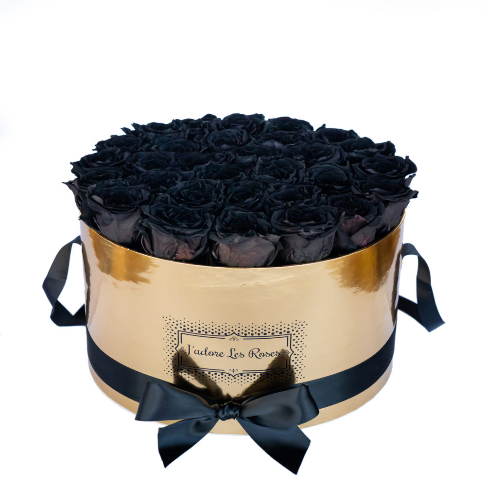 “32 Black infinity roses in gold round box” has been added to your cart.
