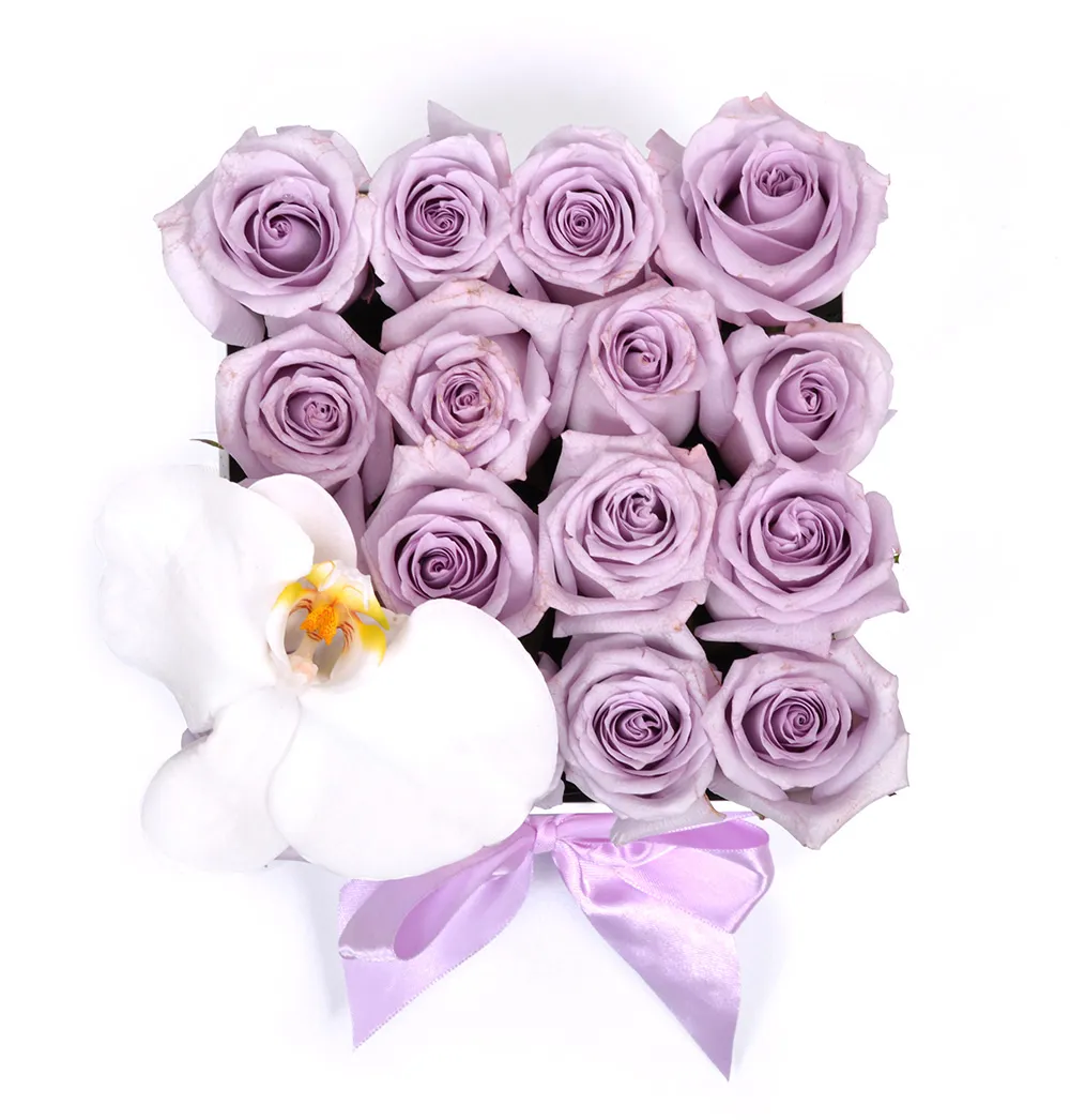 | 130 | Purple Roses in White Small Square Box with Orchid | 16 | 15X15X15 | 300 |