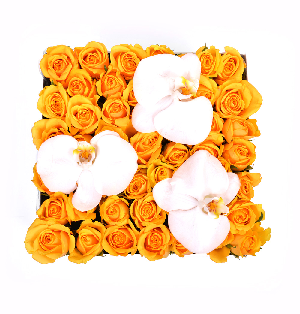 220 Yellow Roses in White Medium Square Box with Orchid 36-49 25X25X20 570